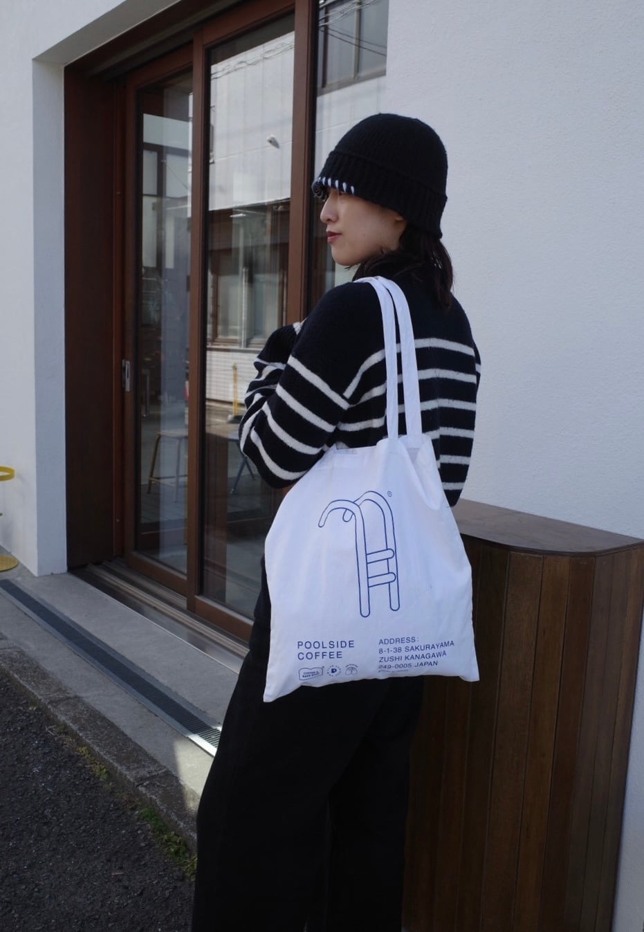 プールのハシゴをイメージされたPOOLSIDE COFFEEオリジナルのロゴ入りトートバッグです。シンプルなデザインのため、性別問わず使いやすいものになっています。 ◻︎本体サイズ W370×H400(mm) 持ち手長さ600(mm)
